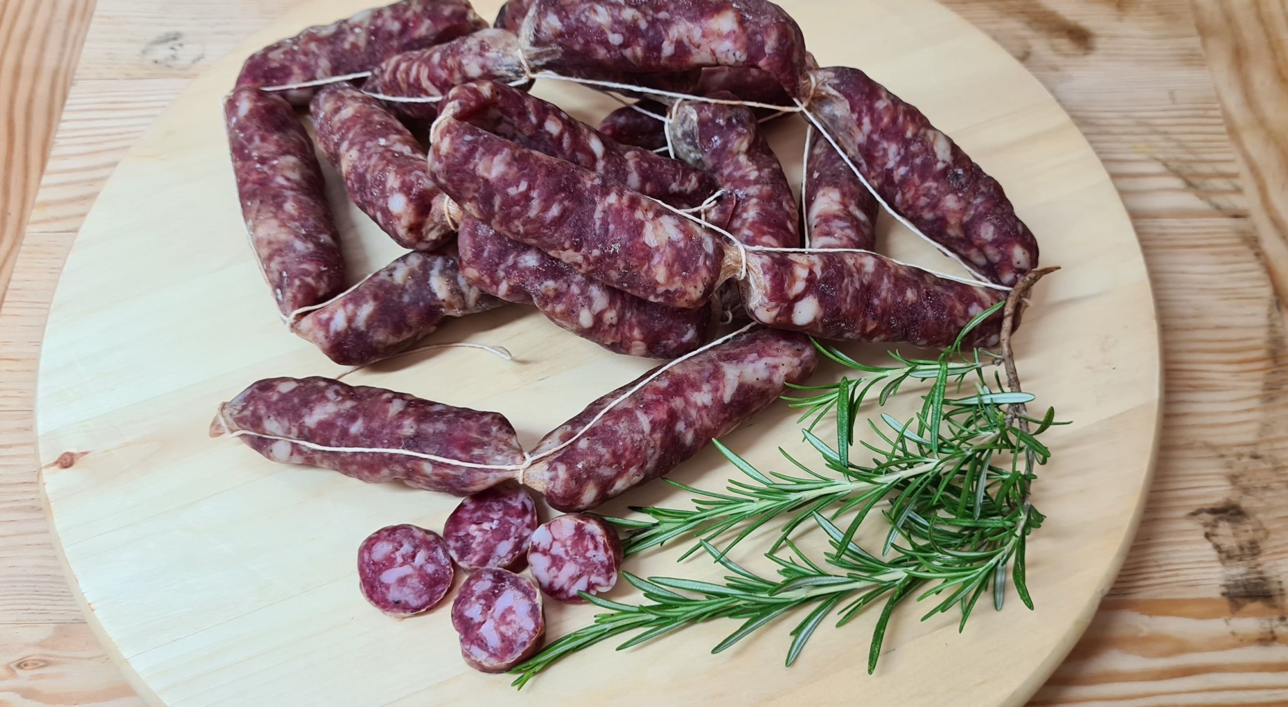 Le Salsicce di Maiale Stagionate sono ottenute da polpa di spalla suina, macinata a grana grossa ed aromatizzato con sale ,pepe e conservanti naturali,insaccata in budello naturale di maiale. La stagionatura dura circa tre settimane, a temperatura controllata con la giusta umidità, da gustare cruda. E’ saporita ma delicata allo stesso tempo.